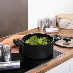 De ergonomiske håndtag i genanvendt bakelit med dobbeltskrue, giver en sikker og behagelig håndtering. Gryden kan anvendes på alle varmekilder og glaslåget er udstyret med et praktisk damphul og tætlukkende silikonekant.