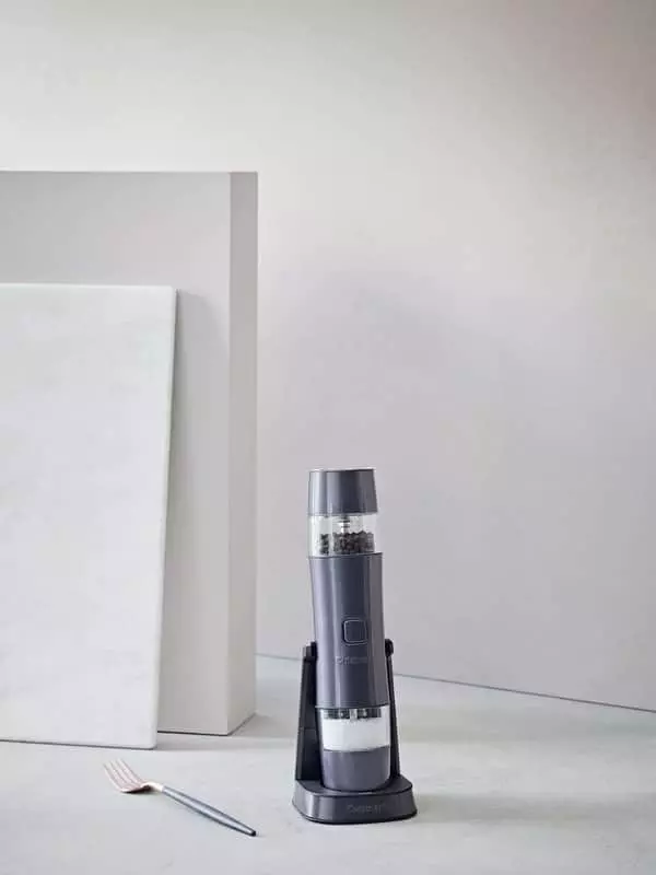 Kværnen kræver ikke batterier, men oplades blot i den medfølgende ladestander, som tilmed er elegant i sit udtryk og fint kan flytte ind på en fast plads i køkkenet.