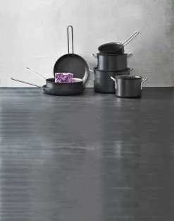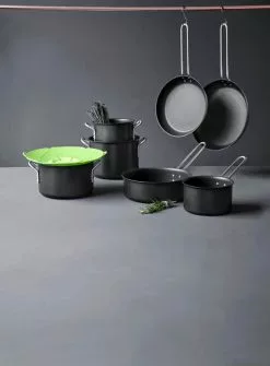 Eva Trios Black Line-serie er en fryd for både æstetikeren og dig, der kun vil nøjes med kvalitetsgrej på køkkenhylden. Black Line serien har Slip-Let® belægning, hvilket gør at maden ikke brænder fast – og så tåler den ovn op til 260° C og kan bruges på alle komfurtyper – også induktion. De brede håndtag giver et godt greb, og håndtagene bliver kun meget varme ved brug på gaskomfur og i ovn – ved brug på andre varmekilder vil du derfor kunne holde på håndtagene.