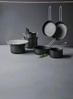 Eva Trios Black Line-serie er en fryd for både æstetikeren og dig, der kun vil nøjes med kvalitetsgrej på køkkenhylden. Black Line serien har Slip-Let® belægning, hvilket gør at maden ikke brænder fast – og så tåler den ovn op til 260° C og kan bruges på alle komfurtyper – også induktion. De brede håndtag giver et godt greb, og håndtagene bliver kun meget varme ved brug på gaskomfur og i ovn – ved brug på andre varmekilder vil du derfor kunne holde på håndtagene.