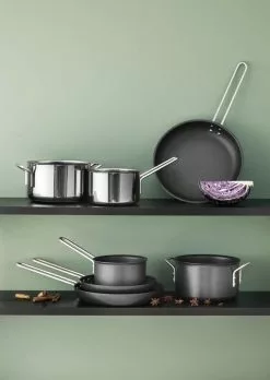Eva Trios Black Line-serie er en fryd for både æstetikeren og dig, der kun vil nøjes med kvalitetsgrej på køkkenhylden. Black Line serien har Slip-Let® belægning, hvilket gør at maden ikke brænder fast – og så tåler den ovn op til 260° C og kan bruges på alle komfurtyper – også induktion. De brede håndtag giver et godt greb, og håndtagene bliver kun meget varme ved brug på gaskomfur og i ovn – ved brug på andre varmekilder vil du derfor kunne holde på håndtagene.