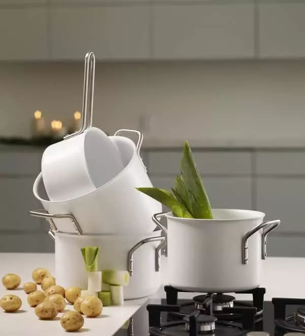 Seriens gryder og pander er alle klædt i et hvidt ydre – smukt, men stadig hårdført. Den hvide keramik kan tage høje varmetemperaturer, og tåler at blive brugt til hverdag. Grydens kant er lavet i aluminium, som skåner det hvide keramik, når du skal banke skeen af eller når låget står og dirrer.