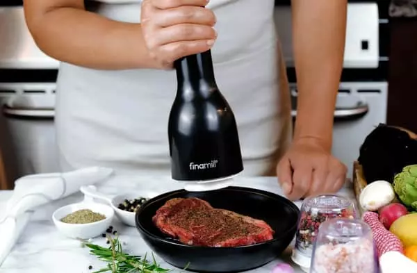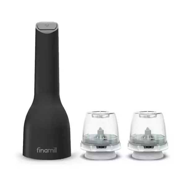 Krydderikværnen fra Finamill er batteridrevet og kan derfor betjenes med én hånd.