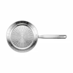 Panden er fremstillet af slidstærkt rustfrit stål, og dens håndtag er fremstillet af 90% genanvendte materialer. Med dens unikke graverede overflade og 3-lags konstruktion sikrer det dig en god stegning med jævn varmefordeling og en nem rengøring efterfølgende.