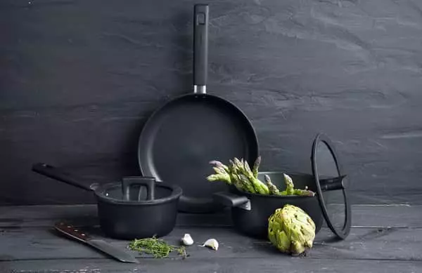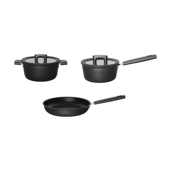 Panderne og gryderne er fremstillet i 70% genanvendt metal og har en ekstra tyk bund, hvilket giver en effektiv og jævn varmefordeling. Grydesættet tåler opvaskemaskine, men Fiskars anbefaler, at du vasker produkterne i hånden for at forlænge levetiden.