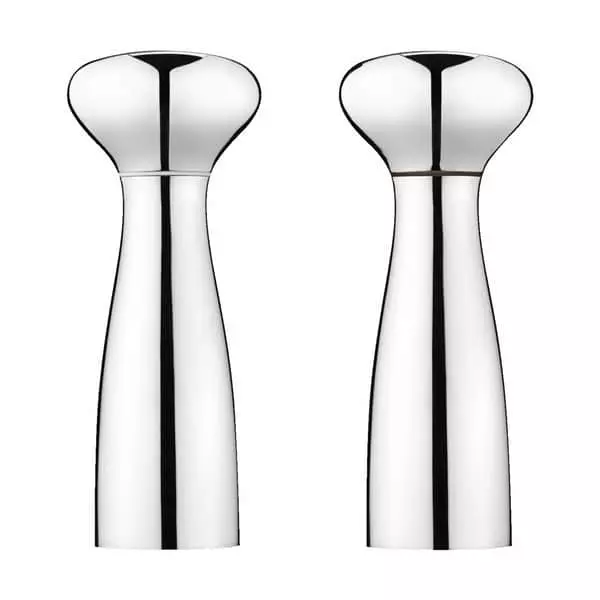 Stilfuldt Alfredo salt- og pebersæt i blankt stål fra Georg Jensen med all grind kværn.