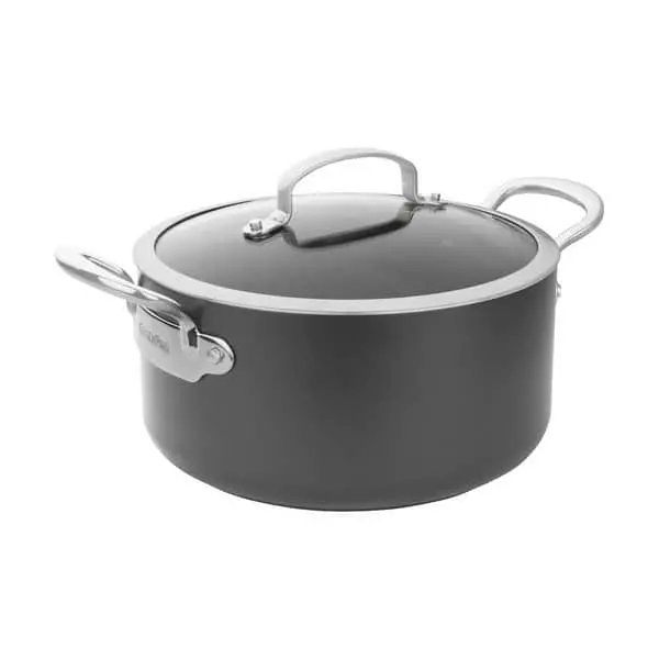 Gryden fra Greenpan er en god all-round gryde. Den er lavet af solidt aluminium med flot svungne håndtag af rustfrit stål, så du kan bruge gryden på alle varmekilder og sætte den i ovnen. Gryden tåler højere varme end hvad en almindelig ovn kan komme op på. Husk derfor at bruge ovnhandsker, da håndtagene bliver meget varme. Låget tåler ikke at komme i ovnen.