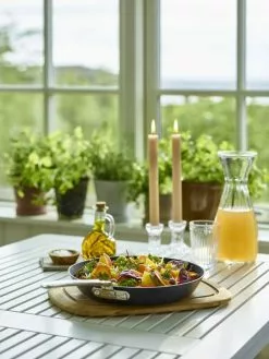 Smartshape panderne er designet til at kunne stables, uden at håndtaget rører ved kanten, og er derfor nemme at opbevare i køkkenskabet. Så du kan roligt starte din samling af Smartshape-pander og få dem i alle størrelserne, uden at pladsen bliver trang.