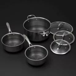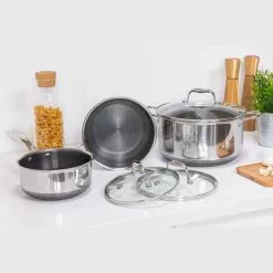 Grydesættet fra Hexclad indeholder både en stor gryde og to kasseroller, så du kan få kogt både grøntsager og ris til familiens middagsmad. Sættet indeholder en stor gryde på 7,5 liter, en kasserolle på 2,8 liter og en kasserolle på 1,8 liter. Sættet er inklusiv låg.