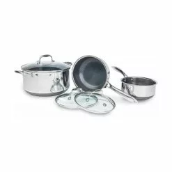 Grydesættet fra Hexclad indeholder både en stor gryde og to kasseroller, så du kan få kogt både grøntsager og ris til familiens middagsmad. Sættet indeholder en stor gryde på 7,5 liter, en kasserolle på 2,8 liter og en kasserolle på 1,8 liter. Sættet er inklusiv låg.