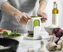Denne grøntsagshakker fra Joseph Joseph gør det hurtigt og nemt at hakke grøntsager. Du kan hakke løg på et splitsekund eller hakke kartofler til pomfritter. Den er nem at tage fra hinanden og er derfor nem at vaske efter brug.