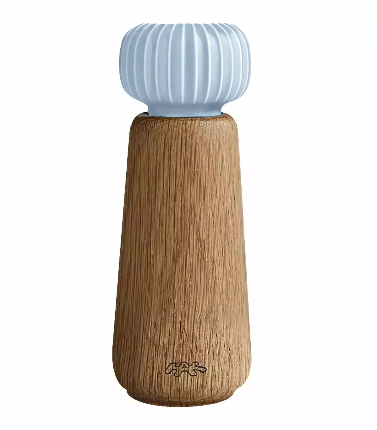 Salt- eller peber-kværnen fra Kählers Hammershøi serie er et spændende møde mellem de elegante nordiske materialer keramik og træ. Kværnen er udsmykket med en fin knop, som udover at være en elegant detalje, også har en funktionel fordel. De smukke riller gør kværnen let at bruge og fylde med krydderier.
