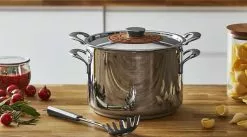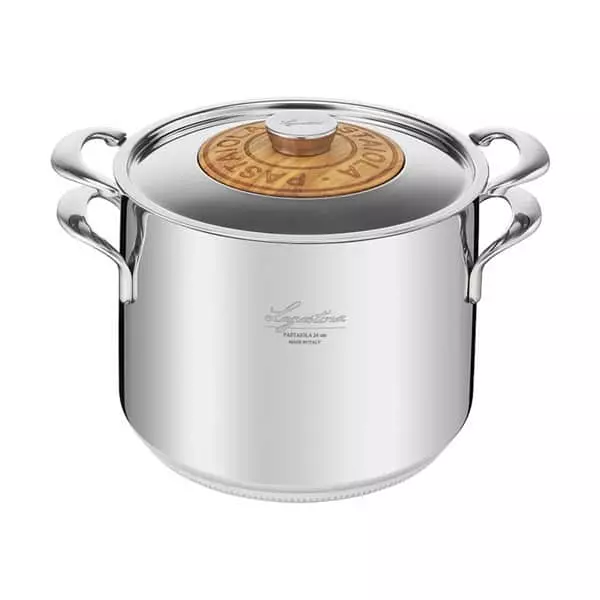 Denne flotte, blanke pastagryde med sit smukke låg i kirsebærtræ er genial til at koge pasta i – ikke mindst pga. den geniale kurv, der holder på pastaen og gør det nemt at hælde vand fra.