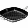 Grillpandens kvadratiske form har en stor stegeflade, og det integrerede hjælpehåndtag gør håndtering nem og sikker. Panden er fremstillet i støbejern, som er kendt for at være et af de bedste materialer til madlavning, da varmen fordeles jævnt og ensartet.