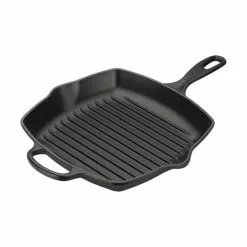 Grillpandens kvadratiske form har en stor stegeflade, og det integrerede hjælpehåndtag gør håndtering nem og sikker. Panden er fremstillet i støbejern, som er kendt for at være et af de bedste materialer til madlavning, da varmen fordeles jævnt og ensartet.