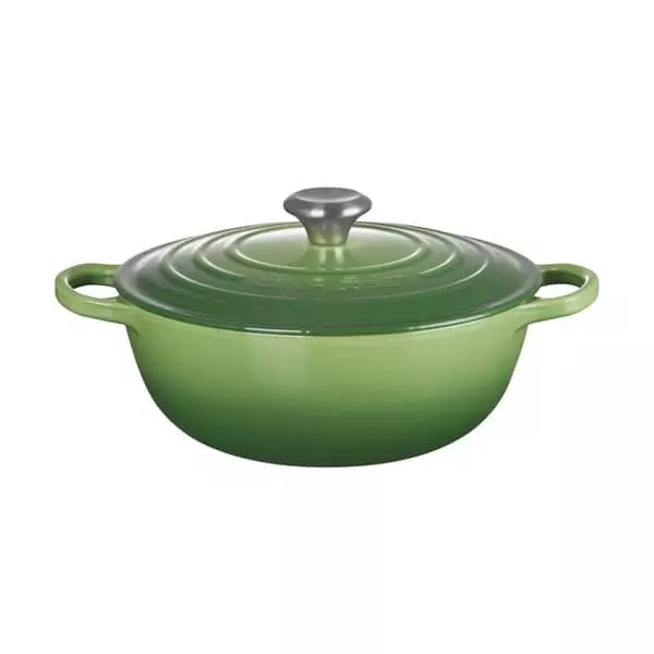 Den elegante støbejernsgryde fra Le Creuset er ideel til eksempelvis simreretter eller grydebrød, da den både tåler høje temperaturer og holder på varmen længe.
