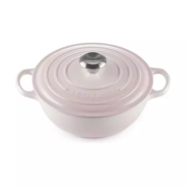 Den elegante støbejernsgryde fra Le Creuset er ideel til eksempelvis simreretter eller grydebrød, da den både tåler høje temperaturer og holder på varmen længe.