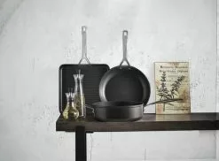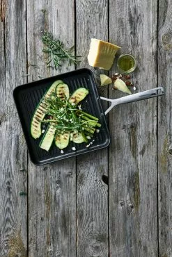 Grillpanden har en indvendig sort emalje, der er specielt fremstillet til madlavning, som kræver høj varme og høje overfladetemperaturer. Panden er helt ideel til at lynstage dine grøntsager, og den kan bruges på alle varmekilder – inkl. induktion, ovn og grillristen på din ude-grill.