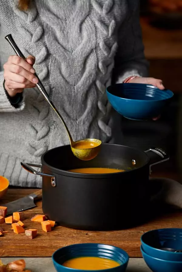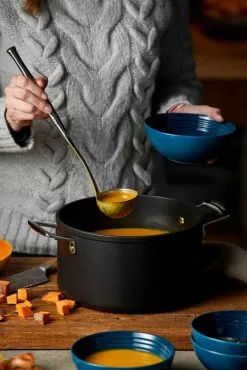 Når de kolde vinterdage skal varmes op med lækre supper, så er gryden fra Le Creuset den perfekte hjælper. Den er suveræn at koge supper i, fordi den har en Toughened Non-Stick belægning, som gør det nemt at få drejet hele suppen rundt uden at noget sætter sig fast langs siderne.
