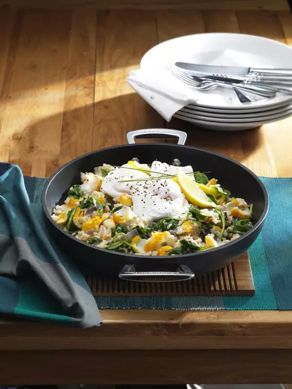 Non-stick belægningen gør det samtidig også nemmere at tilberede kød og blandinger med mælk eller æg til f.eks. pasta carbonára, fordi at væsken ikke sætter sig fast på siderne.