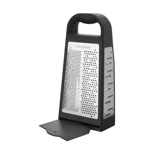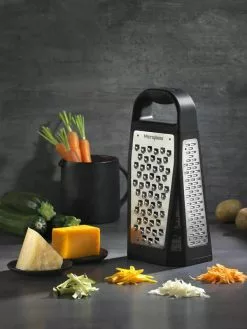 Rivejernet har 5 forskellige rivetyper fordelt på fire sider: fin, grov, ekstra grov, medium ribbe og stor høvl, så du har en 5-i-én løsning til wok, råkoster, salater og meget mere.