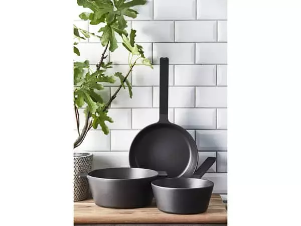 Gryde/pandesættet er fremstillet i støbt aluminium, som fordeler og fastholder varmen jævnt over både bund og sider, samtidig er materialet let. Sættet har indvendig 3-lags non-stick-belægning, der mindsker risikoen for, at maden brænder fast, og beskyttende udvendig coating, der letter rengøringen.Panden har høj kant og håndtag i bakelit ligesom kasserollen, så du undgår at brænde dig på varme håndtag, da de forbliver kolde gennem hele madlavningen. Gryde/pandesættet kan bruges til alle komfurtyper – også induktion. Sættet bør altid kun vaskes med varmt vand, opvaskemiddel og en blød børste, for at bibeholde belægningen. Desuden bør der kun anvendes køkkenredskaber af træ, plast eller silikone, af samme årsag.
