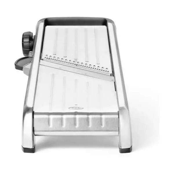 Med SteeL Chef’s mandolinjern fra OXO kan du nemt tilberede nogle spændende og dekorative retter med grøntsager og frugt. Mandolinjernet kan nemlig skære både lige og bølgede skiver, vaffelskiver, julienne-strimler og pommes frites.