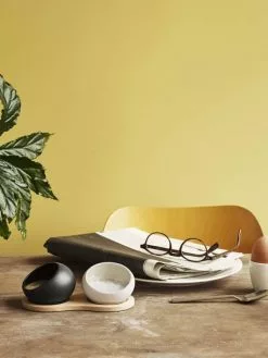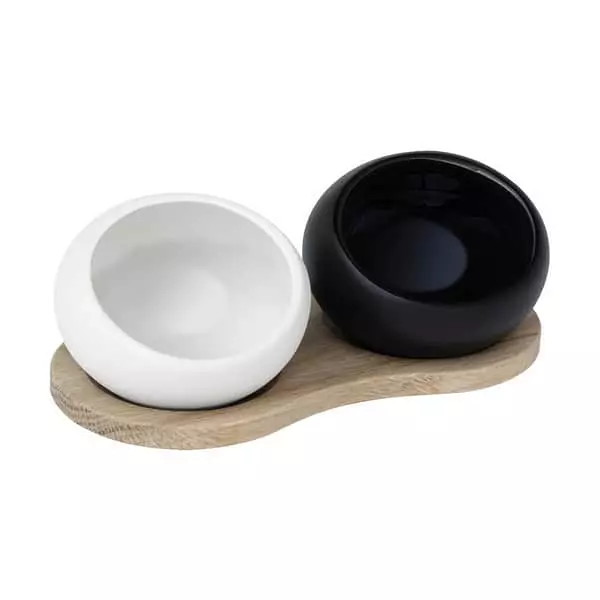 De små kar har et hyggeligt æggeformet design, med en flad base, så de står godt og stabilt på den medfølgende holder i egetræ, og så du samtidig let kan rydde sættet af bordet efter middagen.