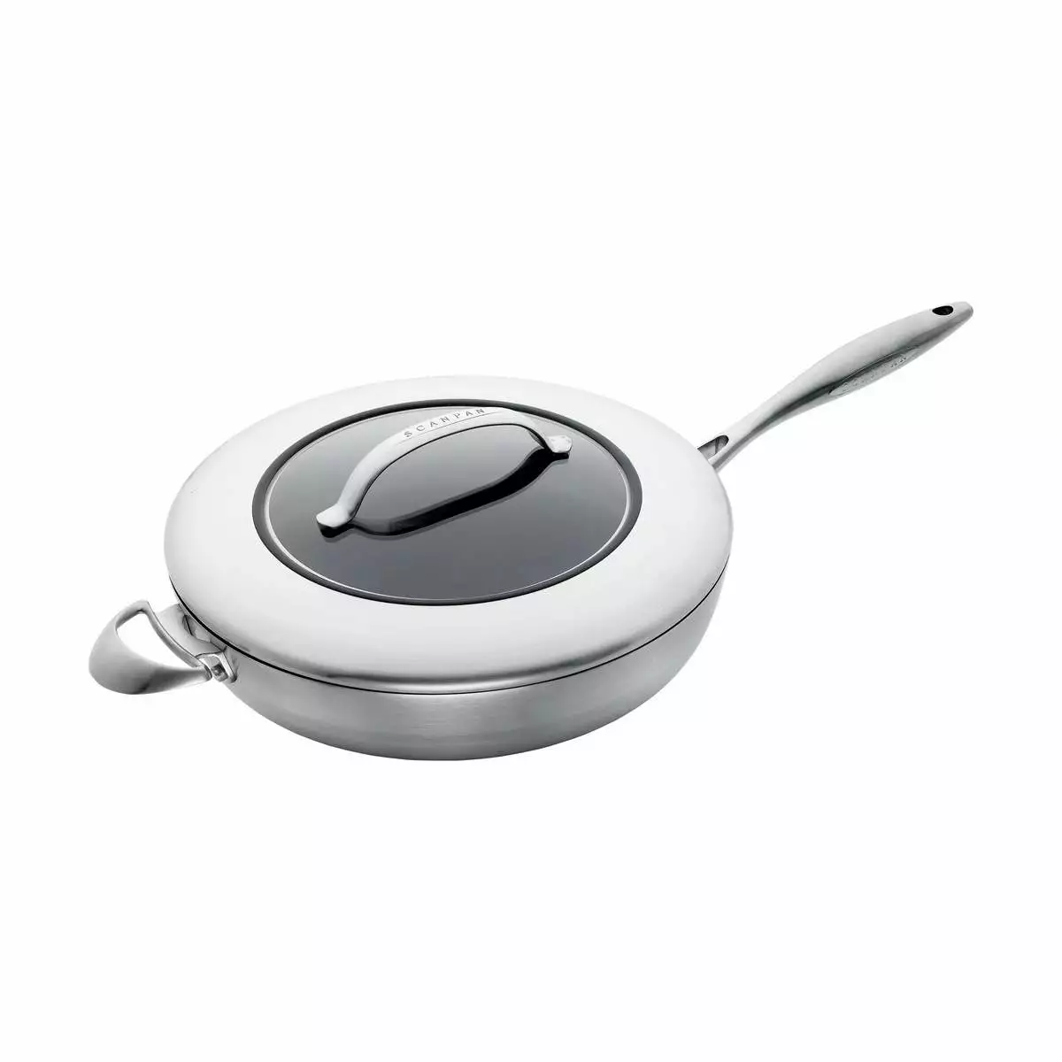 CTX sauterpande fra Scanpan er et elegant og pålideligt indslag i dit køkken. Det gennemtænkte design har en solid og rengøringsvenlig non-stick belægning, der har den fordel, at den tåler alle former for køkkenredskaber. En 5-lags konstruktion med aluminiumskerne giver dig en hurtig og jævn opvarmning, og sauterpandens greb er støbt i rustfrit stål og fastgjort med indvendige rustfri stålnitter, så det holder sig køligt på komfuret. Den store sauterpande har ekstra greb, som gør det nemmere at løfte panden, når den er fuld. Sauterpanden kan indeholde 4,5 liter og kan benyttes på alle varmekilder samt i ovn op til 250° C. Scanpan giver dig 5 års garanti.