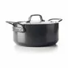 Kokkerer som de professionelle med Scanpans HaptIQ gryde med glaslåg. Gryden er lavet i aluminium og blankpoleret stål og rummer 4,8 liter. På grund af dens særlige belægning kan du stege helt uden fedt – og bruge metalredskaber uden at gøre skade på gryden.