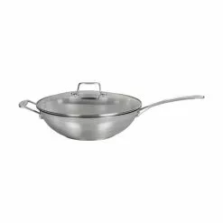 Wokken fra Scanpan er lavet i rustfrit stål har et glaslåg, som holder godt på varmen. Den kan bruges på alle varmekilder og tåler også opvaskemaskine.