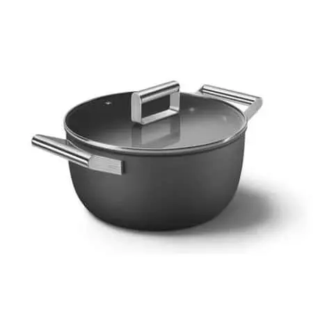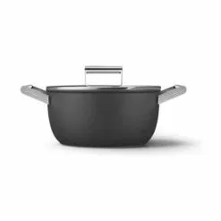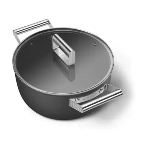 Denne lækre non-stick aluminiumsgryde fra SMEG fungerer på alle typer kogeplader herunder også induktion, og den kan samtidig bruges i ovn på maksimalt 250 grader. Det medfølgende glaslåg har et damphul, så fugten lukkes ud ved madlavning.