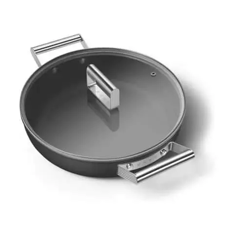 Denne lækre non-stick aluminiumssauterpande fra SMEG fungerer på alle typer kogeplader herunder også induktion, og den kan samtidig bruges i ovn på maksimalt 250 grader. Det medfølgende glaslåg har et damphul, mens sauterpanden har to håndtag, der gør den meget praktisk og nem at arbejde med.
