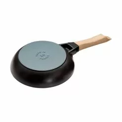 Lille støbejernspande på 20 cm fra STAUB med lyst træhåndtag, som forbliver køligt under madlavninge. Kan bruges på alle typer komfurer.