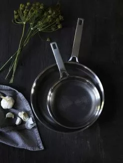 Stegepander fra Timm Vladimir Kitchen er designet med en 3-ply konstruktion. En 3-ply konstruktion består af lagene: stål, aluminium, stål og giver en bedre varmefordeling på hele stegefladen.